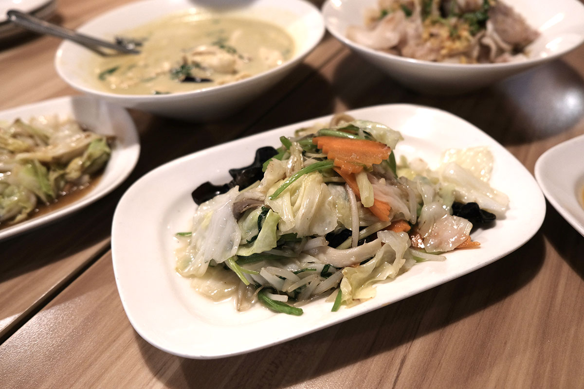 原先只點了上面那盤高麗菜,實在太愛吃青菜了覺得分量不太夠,又再加點了什錦蔬菜,蒜炒香氣十足。兩道吃起來基本上味道差不多,但什錦時蔬多了木耳和菇類、紅蘿蔔,建議人數多的話可直接炒兩盤。