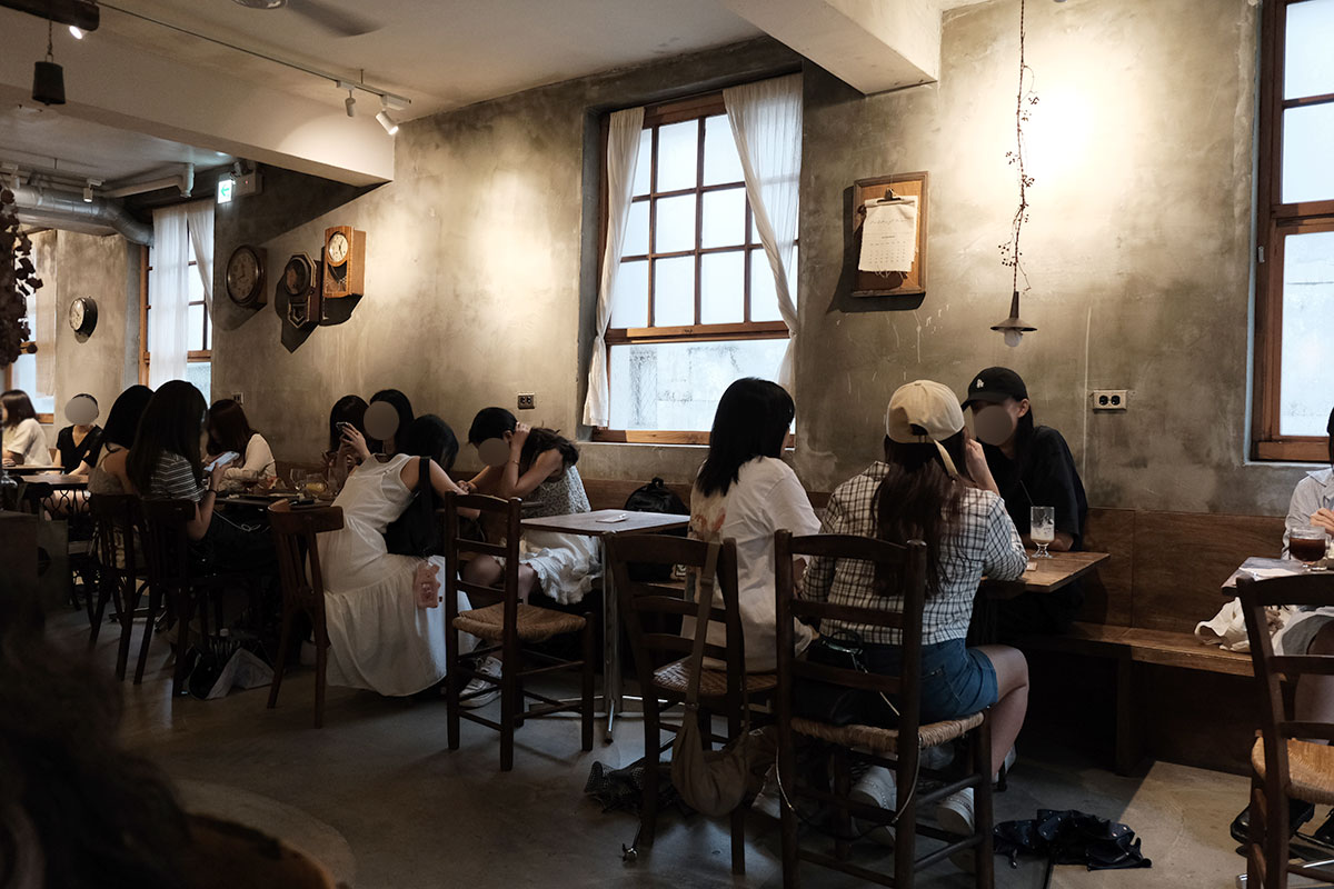 當天八成以上都是年輕女生,嘰嘰喳喳的聊天好不熱鬧,不會過於吵雜就是一般咖啡廳的正常音量,若想辦公讀書的話就不太適合。也有幾桌是日韓港的遊客,或許是自由行推薦景點?總之,雖然是下雨天但人潮依舊絡繹不絕呢!