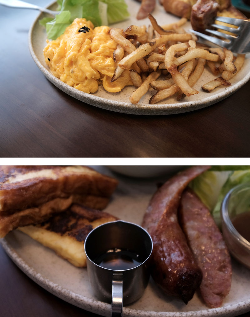 我這次選的是自選早午餐,基本價為 375 元,搭配了法式吐司(+65)、義大利鄉村風味豬肉腸(+0)、炒蛋(+0)、燕麥優格碗(+25)和手壓新鮮薯條(+20),全部加起來總價是 485 元。