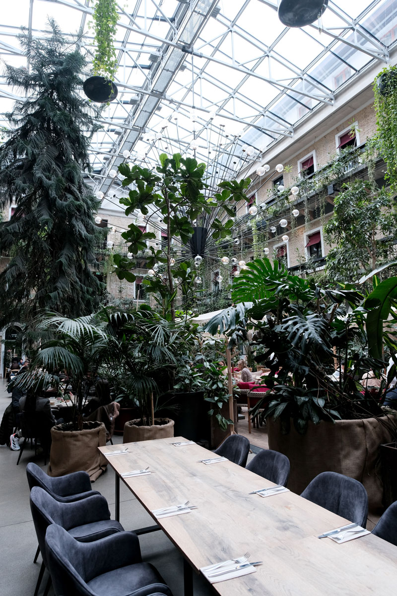 布達佩斯,植物系餐廳,陽光灑落在滿室綠意的透明屋頂下