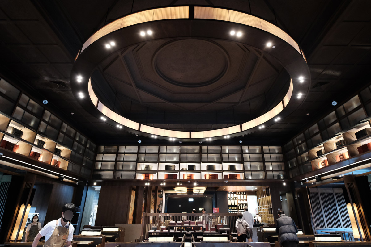 從門口往內拍蠻好看的,挑高的天花板設計很漂亮,線條感讓整個空間看起來更有層次。搭配大量木頭桌椅與偏深色的配置,整體氛圍帶著一點沉穩感,古色古香的風格很耐看的。